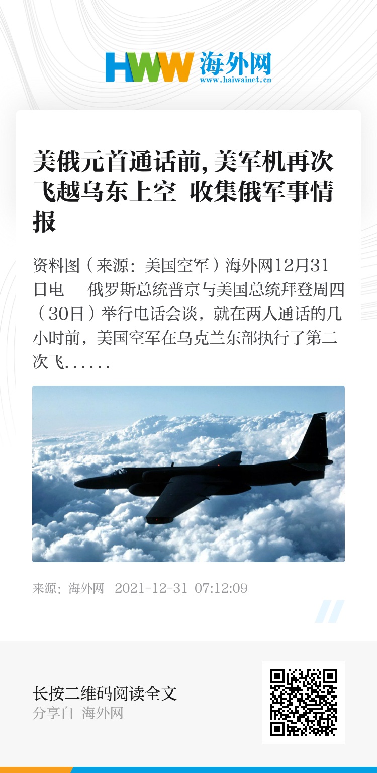 海外网12月31日电 俄罗斯总统普京与美国总统拜登周四(30日)举行电话会谈,就在两人通话的几小时前,美国空军在乌克兰东部执行了第二次飞行任务。