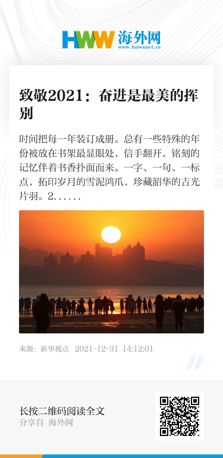 2021年这本大书即将合上,书中写满爱与勇敢的注脚,那是留给后人读懂这不平凡一年的索引。2022年即将开启,愿你平安如意,盼你锐意进取。作别2021,奋进是最美的挥别。因为我们坚信,在过去一百年赢得了伟大胜利和荣光的中国共产党和中国人民,必将在新时代新征程上赢得更加伟大的胜利和荣光!