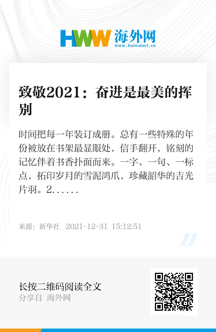 2021年这本大书即将合上,书中写满爱与勇敢的注脚,那是留给后人读懂这不平凡一年的索引。2022年即将开启,愿你平安如意,盼你锐意进取。作别2021,奋进是最美的挥别。因为我们坚信,在过去一百年赢得了伟大胜利和荣光的中国共产党和中国人民,必将在新时代新征程上赢得更加伟大的胜利和荣光!