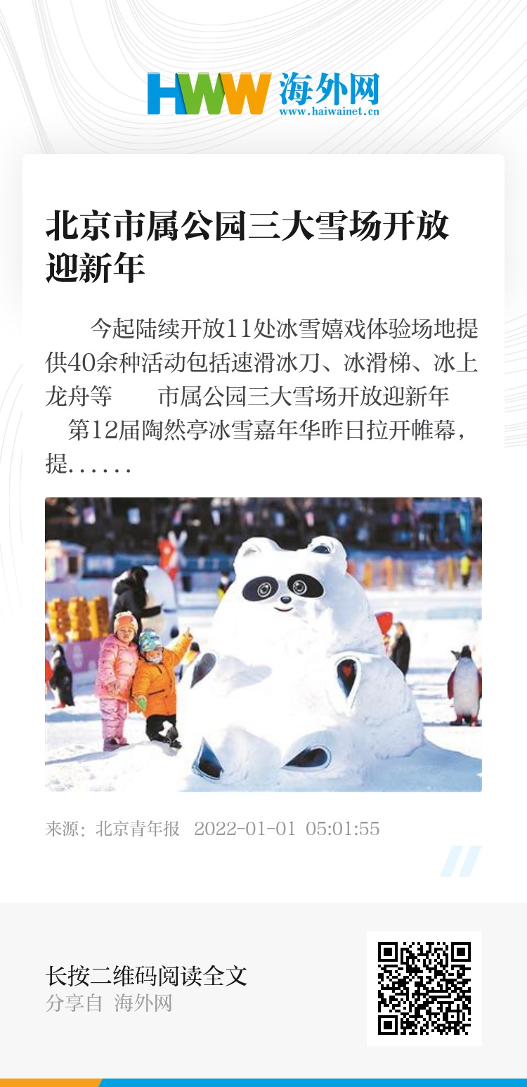 本报讯(记者 王斌)北京青年报记者从市公园管理中心获悉,作为第八届北京市属公园冰雪游园会的首轮开幕活动,陶然亭、紫竹院、玉渊潭三家市属公园的雪地运动项目昨日率先迎客,为元旦假期增添冰雪世界的情境体验。各运动场地布置了千余面道旗、彩旗以及冬奥知识展板,营造“逛公园、上冰雪、迎冬奥”的激情氛围。虽然冰场尚未开放,市民游客也能提前感受冬季运动、冬奥盛会带来的运动乐趣。