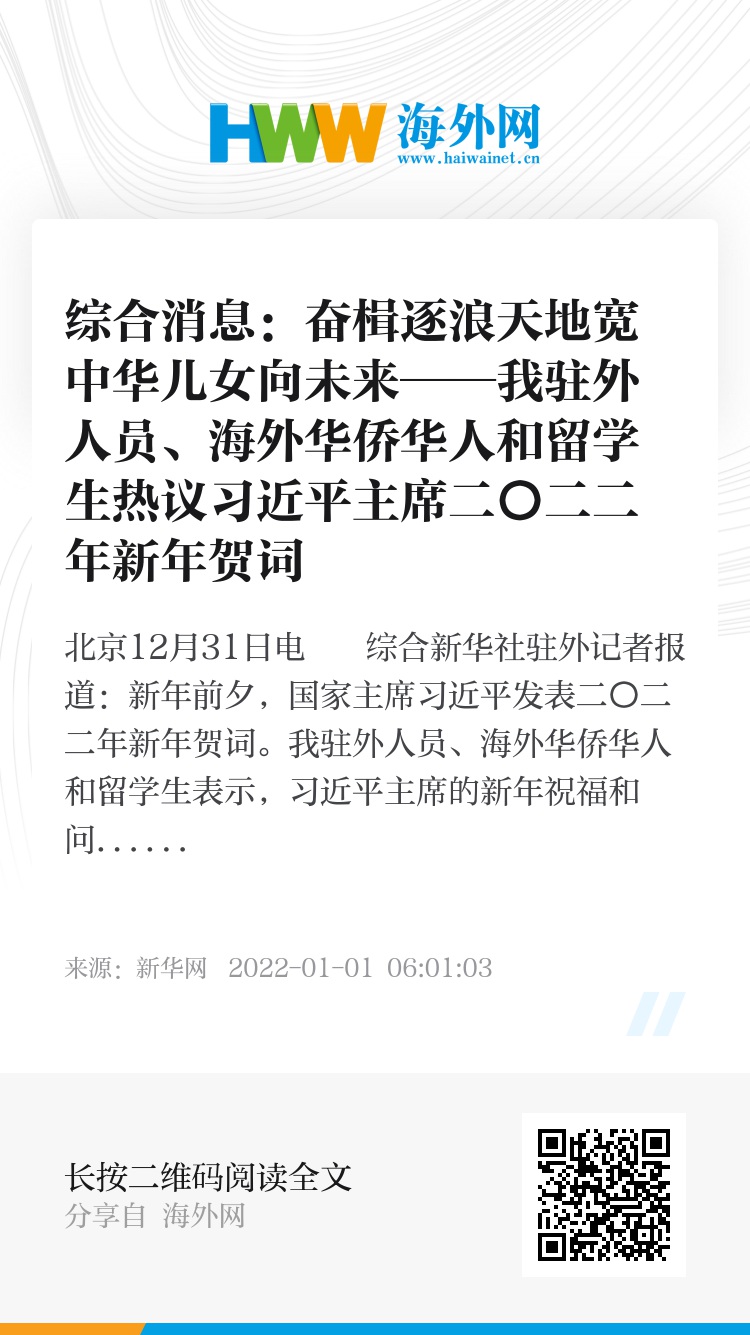 新华社北京12月31日电 综合新华社驻外记者报道:新年前夕,国家主席习近平发表二〇二二年新年贺词。我驻外人员、海外华侨华人和留学生表示,习近平主席的新年祝福和问候令在海外的中华儿女倍感温暖、备受鼓舞,2022年,他们将踔厉奋发、笃行不怠,为祖(籍)国全面建设社会主义现代化国家、实现第二个百年奋斗目标和推动构建人类命运共同体作出新的贡献。