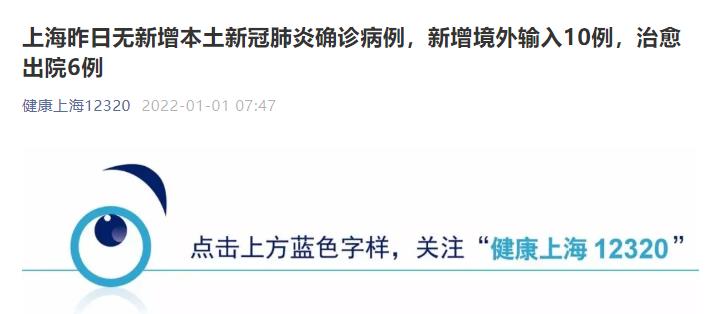 据“健康上海12320”微信公众号消息,2021年12月31日0—24时,通过口岸联防联控机制,上海报告10例新增境外输入性新冠肺炎确诊病例。新增治愈出院5例,其中来自尼日利亚1例,来自塞尔维亚1例,来自英国1例,来自阿联酋1例,来自格鲁吉亚1例。