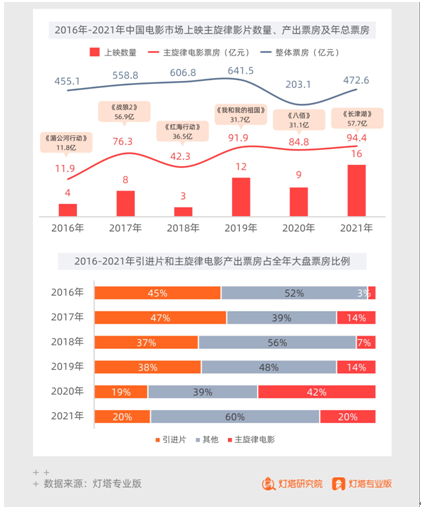 在内容市场方面,“中国叙事”成为过去一年的核心主题。2021年的进口片票房在大盘中占比20%,不到2016年占比的1/2;另一面,由主旋律题材引领的国产电影,继续在这一年获得稳定发展。其中,电影《长津湖》以57.7亿票房打破影史纪录,创作上持续贴近时代精神,延续了“中国叙事”。