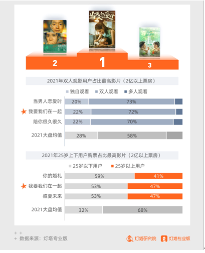 这部分影片中,爱情片《我要我们在一起》助推“520”这个新档期达到2.3亿票房,成为经典案例。该影片定档“520”,并在特殊的13:14开启秘钥,将爱情仪式感推到极致。数据显示,该影片25岁以下用户占比,在全年票房超2亿的影片中高居第二;该片结伴观影比例则高达72%,成为年度第一。