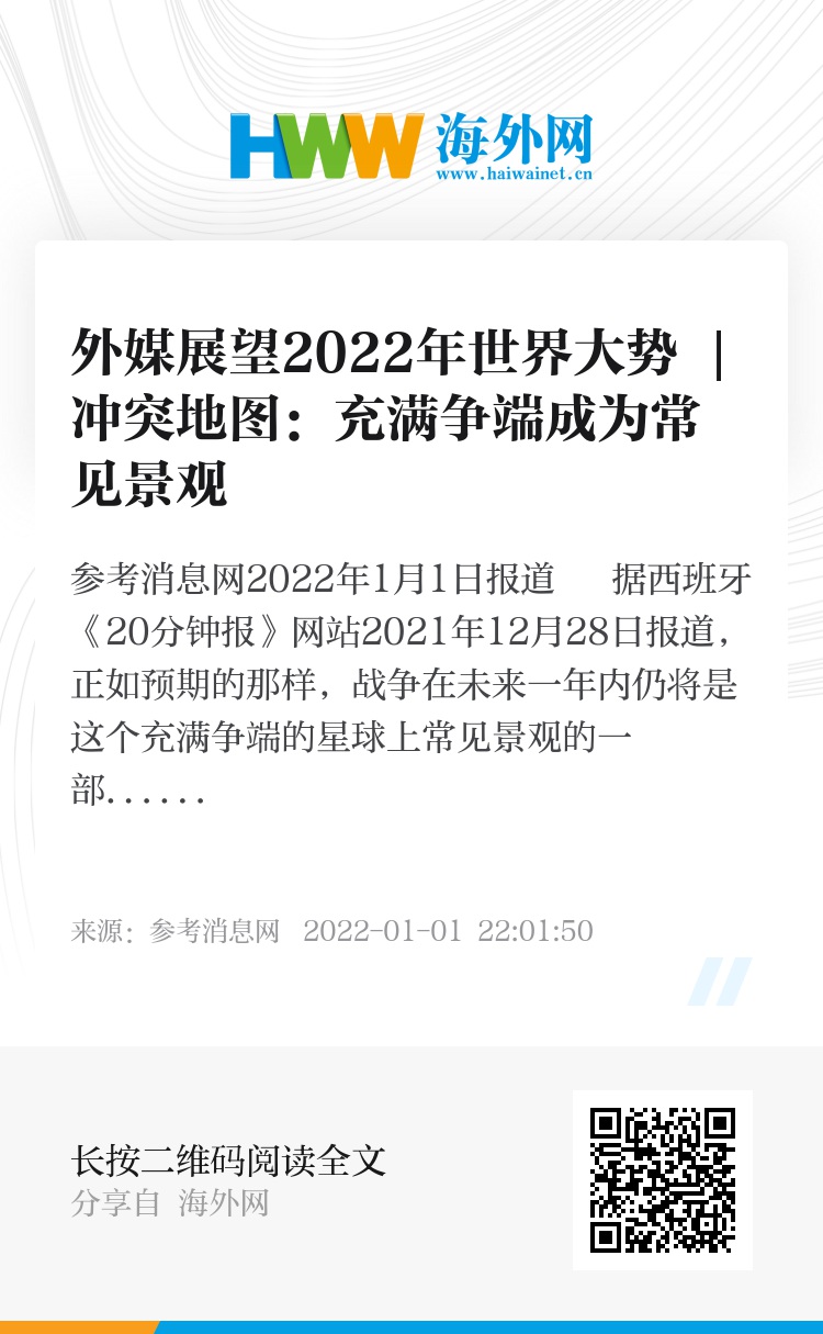 报道最后称,2021年,战争、抗议和国家间的紧张局势提醒世界,这一年中暴力战胜了对话。2022年会发生什么还有待书写。