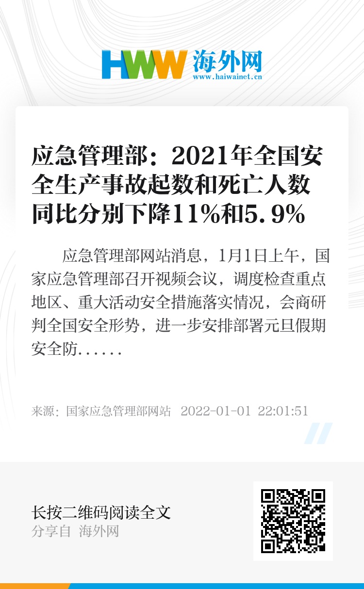 会议指出,2021年全国安全生产事故起数和死亡人数同比分别下降11%和5.9%,创造了新中国成立以来连续27个月无特别重大事故的历史最长间隔期;受灾人次、因灾死亡失踪人数、倒塌房屋数和直接经济损失,比近5年均值分别下降28%、10%、19%和5%。