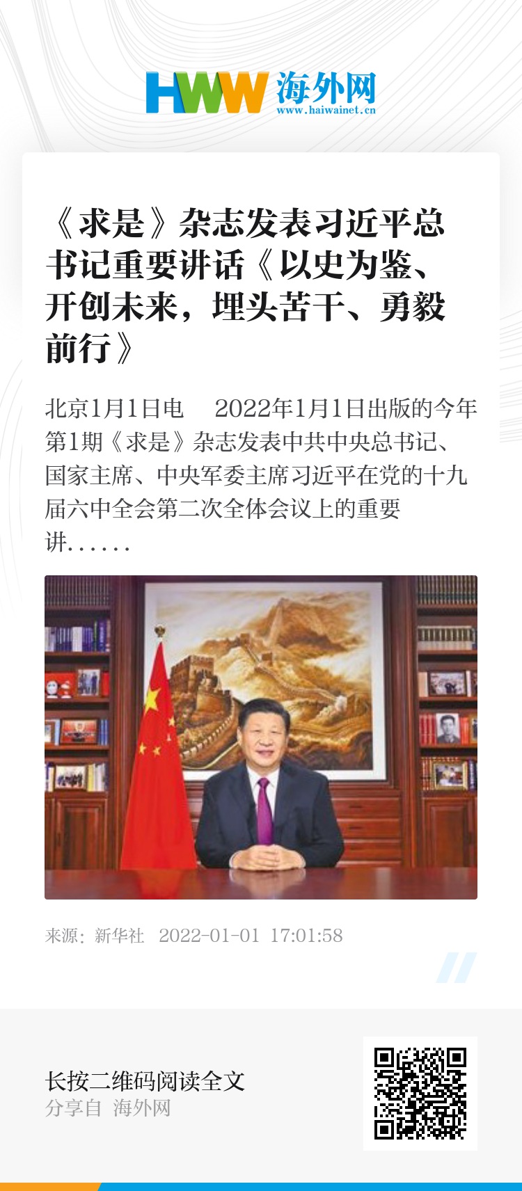 新华社北京1月1日电 2022年1月1日出版的今年第1期《求是》杂志发表中共中央总书记、国家主席、中央军委主席习近平在党的十九届六中全会第二次全体会议上的重要讲话《以史为鉴、开创未来,埋头苦干、勇毅前行》。