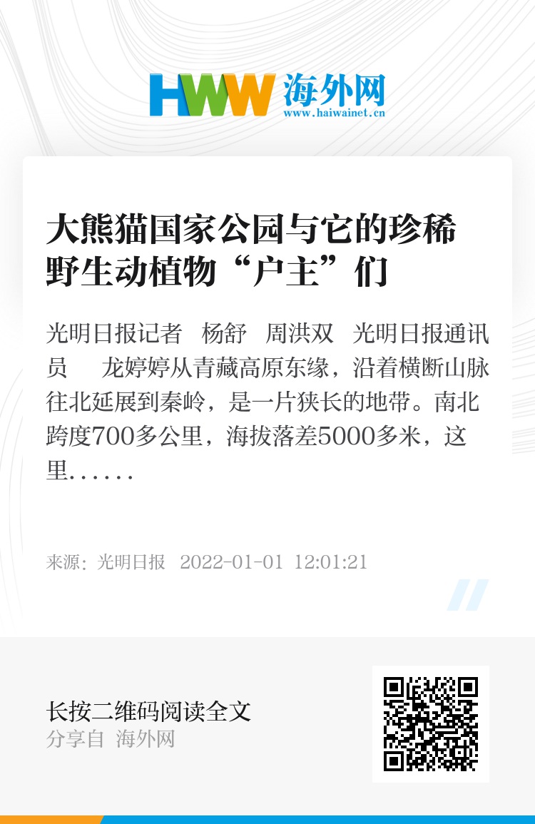 2021年10月12日,在联合国《生物多样性公约》第十五次缔约方大会上,中国向世界宣布:大熊猫国家公园等首批五个国家公园正式设立。地跨川陕甘三省,纵横岷山、邛崃山、大小相岭山系,大熊猫国家公园把过去各个相对独立的保护“岛屿”串联了起来,共同构筑起大熊猫的“保护伞”。