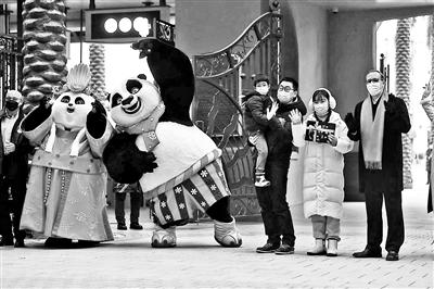 装饰一新的北京环球度假区洋溢着节庆的欢乐氛围。公园入口处,戴着红色围巾的功夫熊猫等环球经典IP卡通人物迎候着来自八方的游客。