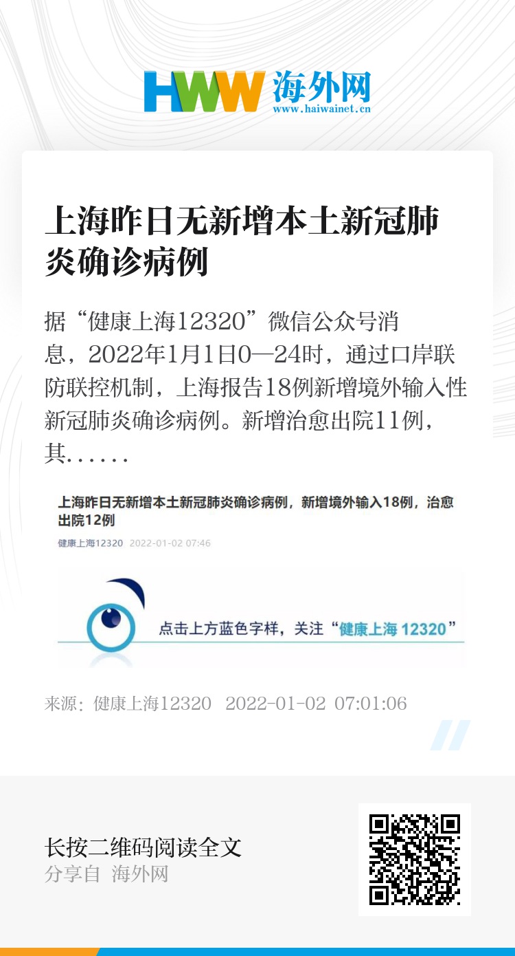 据“健康上海12320”微信公众号消息,2022年1月1日0—24时,通过口岸联防联控机制,上海报告18例新增境外输入性新冠肺炎确诊病例。新增治愈出院11例,其中来自西班牙2例,来自美国2例,来自以色列2例,来自俄罗斯1例,来自阿联酋1例,来自新加坡1例,来自英国1例,来自日本1例。