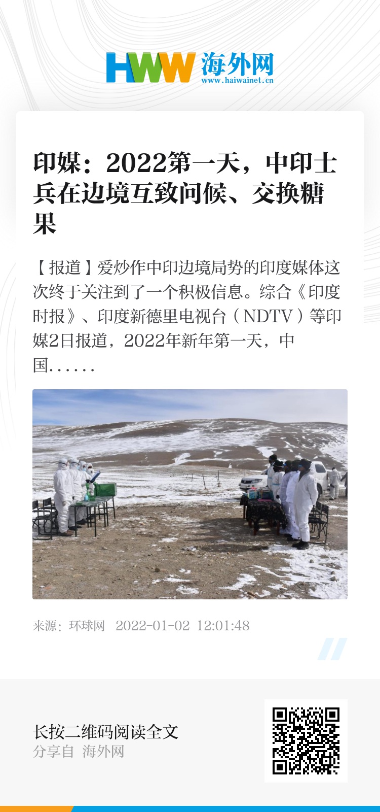 【环球网报道】爱炒作中印边境局势的印度媒体这次终于关注到了一个积极信息。综合《印度时报》、印度新德里电视台(NDTV)等印媒2日报道,2022年新年第一天,中国和印度军队在中印边界实际控制线上的10个地点,包括所谓“拉达克”地区东部的两国“摩擦点”,互致新年问候并交换糖果。