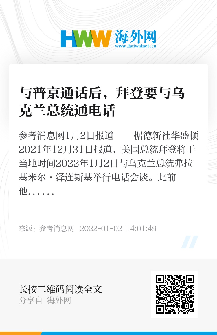 报道称,白宫2021年12月31日说,拜登计划在这次电话会谈中提及俄罗斯军队在乌克兰边界附近集结的问题。它还说,拜登还将谈到为帮助解决这一问题计划举行的美俄对话的准备工作。