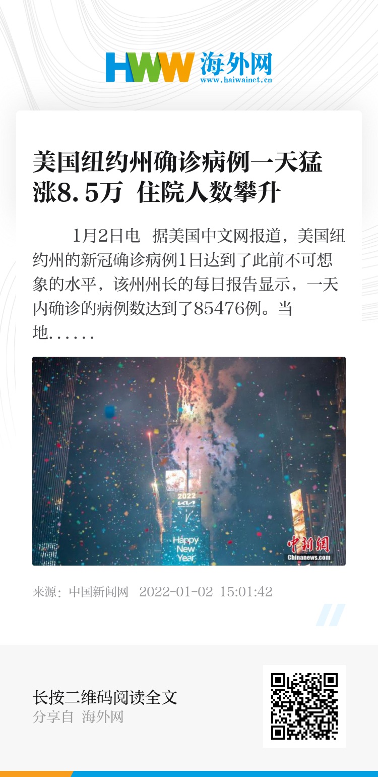 中新网1月2日电 据美国中文网报道,美国纽约州的新冠确诊病例1日达到了此前不可想象的水平,该州州长的每日报告显示,一天内确诊的病例数达到了85476例。