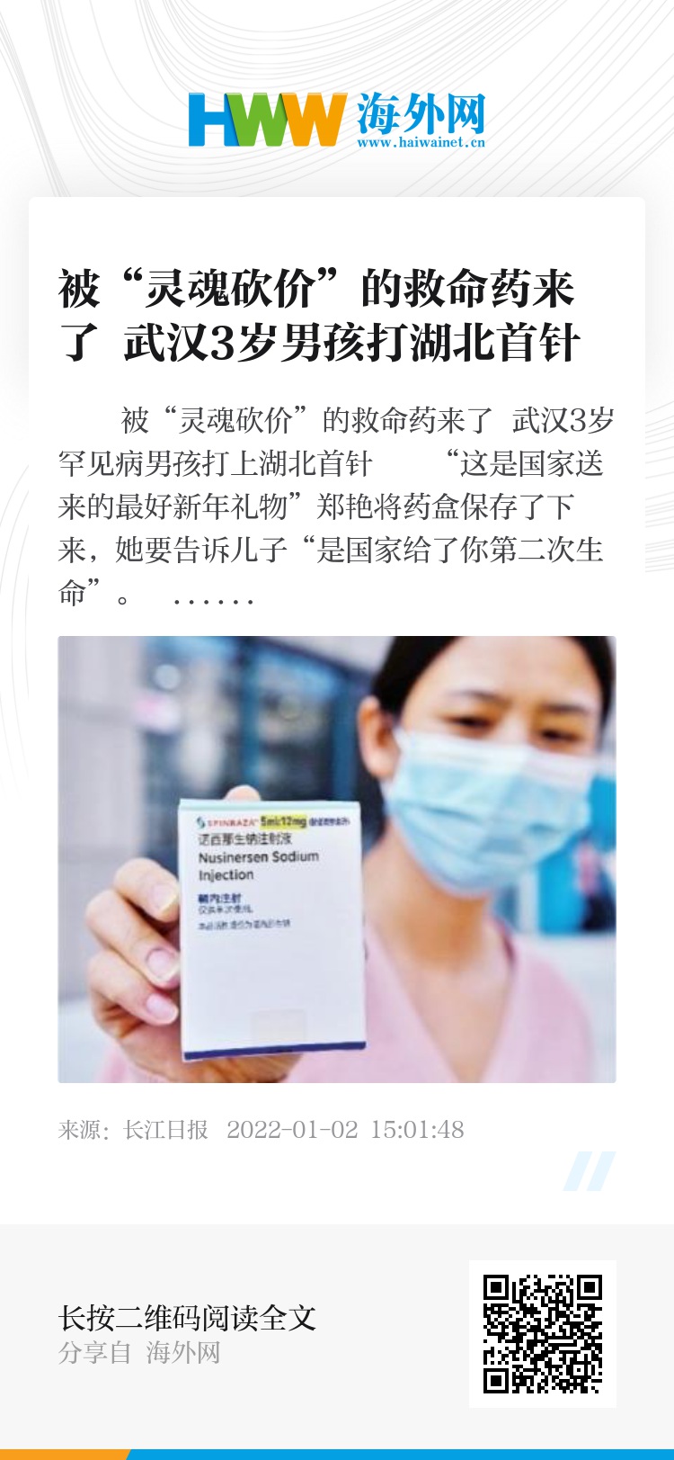 长江日报讯(记者张维纳)市民郑艳期盼的新年如期而至。2022年的第一天,郑艳3岁儿子睿睿终于打上了“救命针”。
