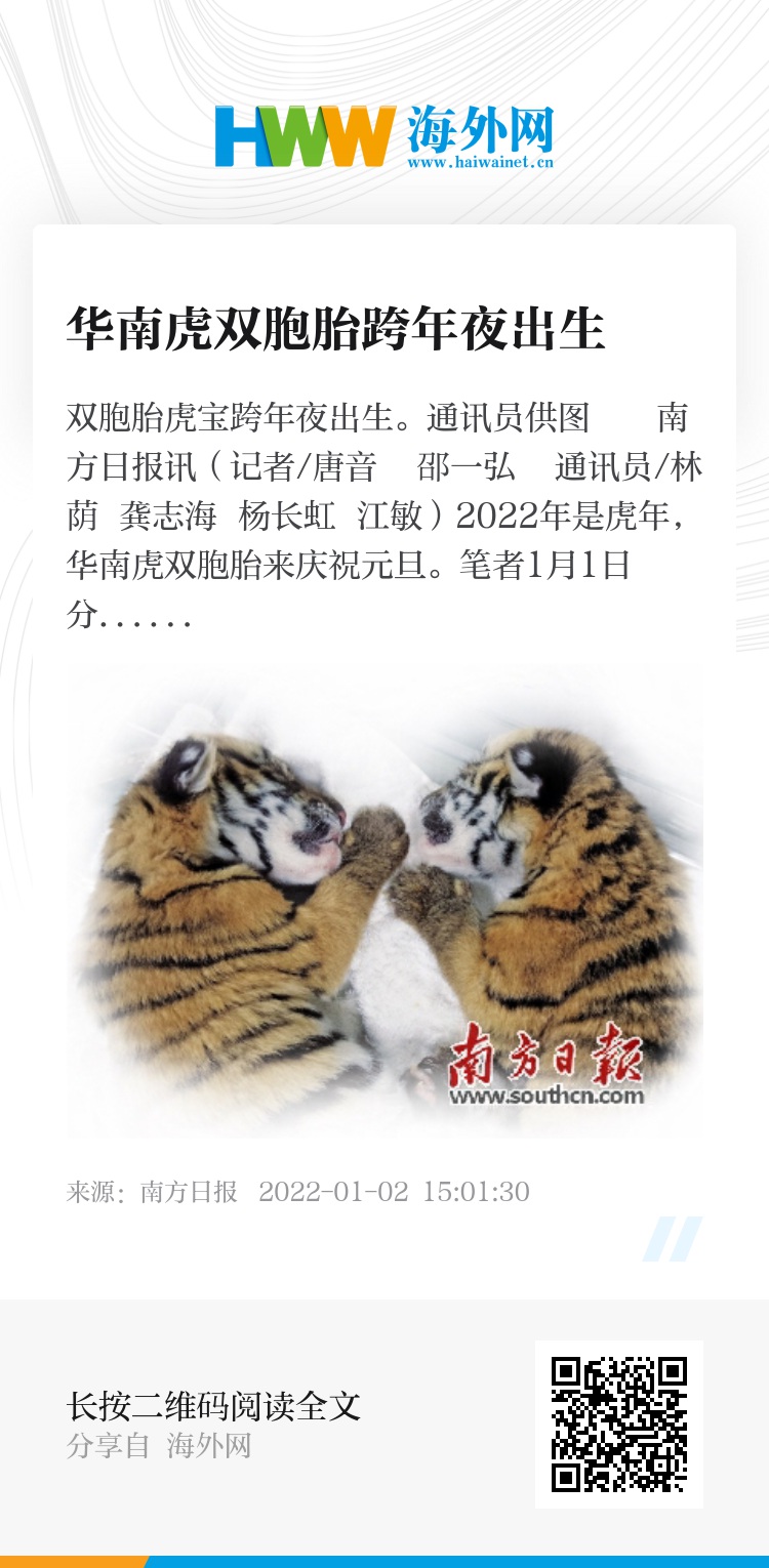 南方日报讯(记者/唐音 邵一弘 通讯员/林荫 龚志海 杨长虹 江敏)2022年是虎年,华南虎双胞胎来庆祝元旦。笔者1月1日分别从省林业局、韶关华南虎繁育研究基地获悉,2021年12月31日23时02分、26分,华南虎妈妈“梦梦”顺利产下2只华南虎幼崽。