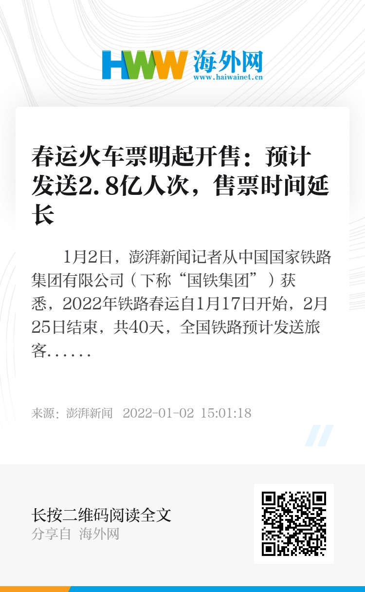 1月2日,澎湃新闻记者从中国国家铁路集团有限公司(下称“国铁集团”)获悉,2022年铁路春运自1月17日开始,2月25日结束,共40天,全国铁路预计发送旅客2.8亿人次,同比增长28.5%。按照火车票提前15天发售的安排,2022年1月3日,铁路部门将开始发售2022年春运火车票。