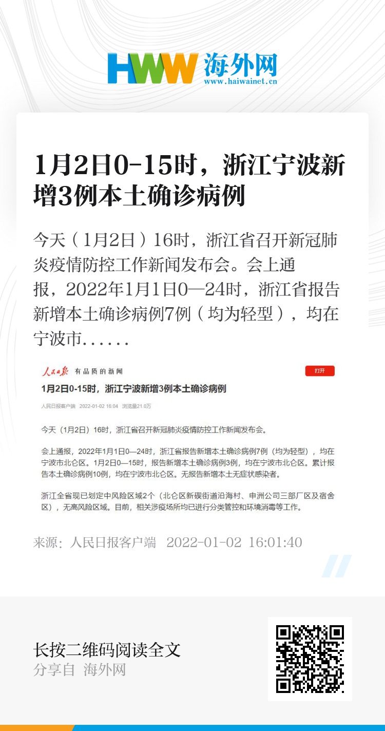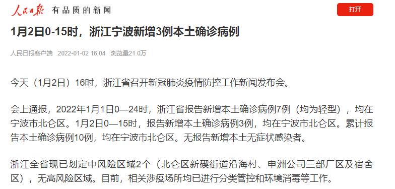 会上通报,2022年1月1日0—24时,浙江省报告新增本土确诊病例7例(均为轻型),均在宁波市北仑区。1月2日0—15时,报告新增本土确诊病例3例,均在宁波市北仑区。累计报告本土确诊病例10例,均在宁波市北仑区。无报告新增本土无症状感染者。