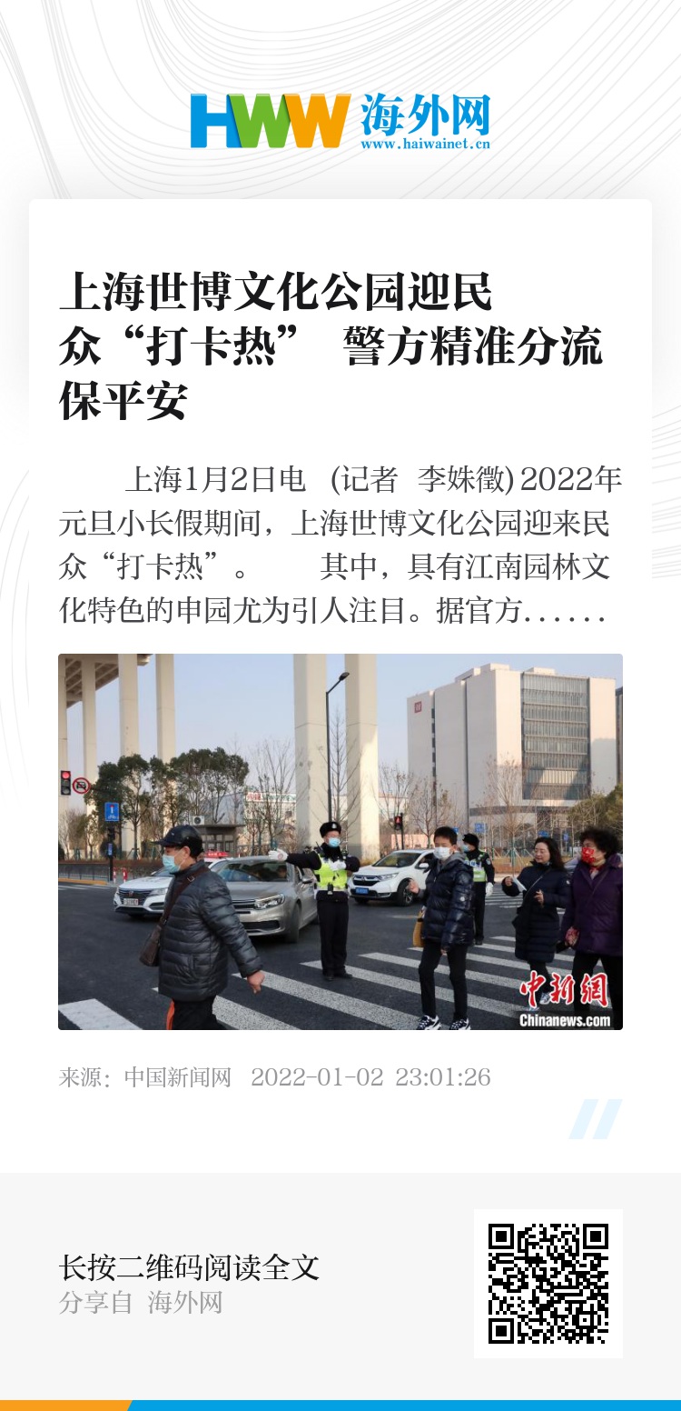 据上海浦东警方表示,针对热门景区游客集中扎堆的情况,世博园区公安处备足警力,沿公园在济坤路上的主入口处提前设置提醒岗,调集警辅力量与园区志愿者,提醒市民注意热门景点预约展览制度。现场还同步架起了预约二维码板与预约形式告知牌。