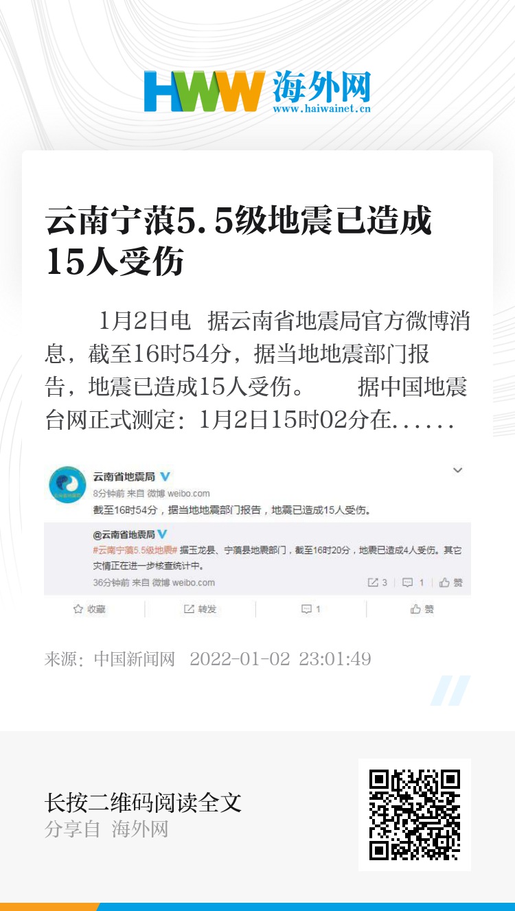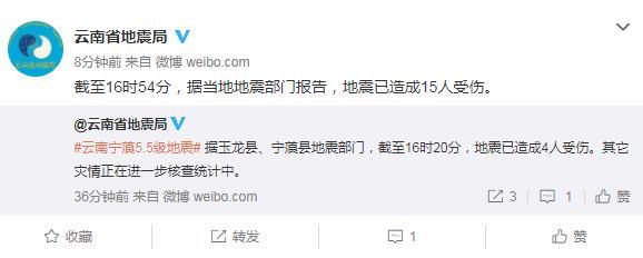 中新网1月2日电 据云南省地震局官方微博消息,截至16时54分,据当地地震部门报告,地震已造成15人受伤。
