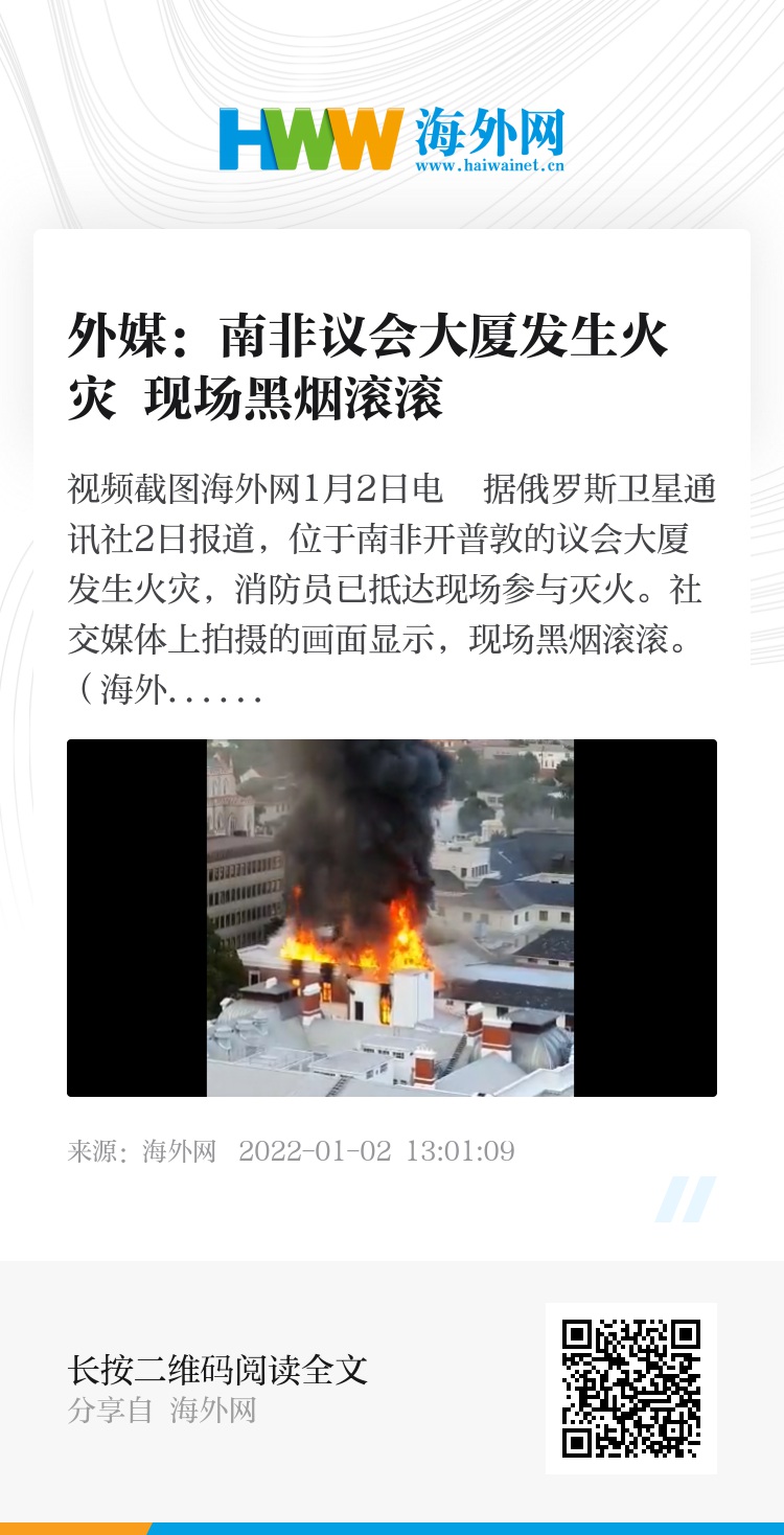 海外网1月2日电 据俄罗斯卫星通讯社2日报道,位于南非开普敦的议会大厦发生火灾,消防员已抵达现场参与灭火。社交媒体上拍摄的画面显示,现场黑烟滚滚。(海外网 张霓)
