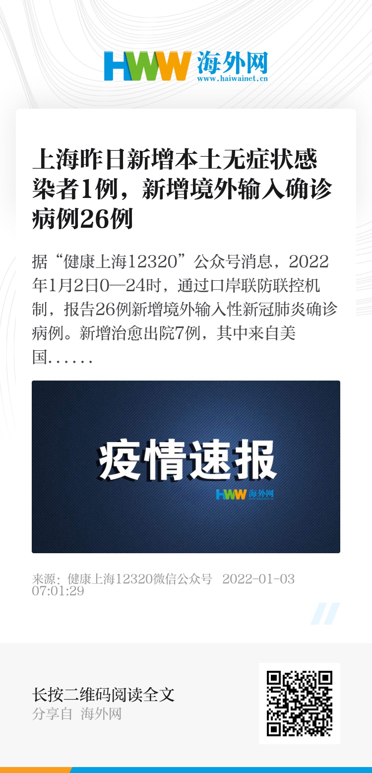 上海昨日新增本土无症状感染者1例,新增境外输入确诊病例26例