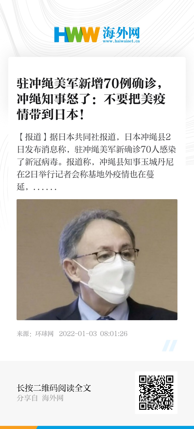 共同社报道称,驻冲绳美军各基地等的详情以及是否包括奥密克戎毒株则不清楚。驻冲绳美军感染者总计达3683人。报道称,玉城在记者会上表示,美军并未彻底采取戴口罩及检测等防疫措施,他强烈谴责称“感到非常愤怒,呼吁不要把美国的疫情带到日本来”。