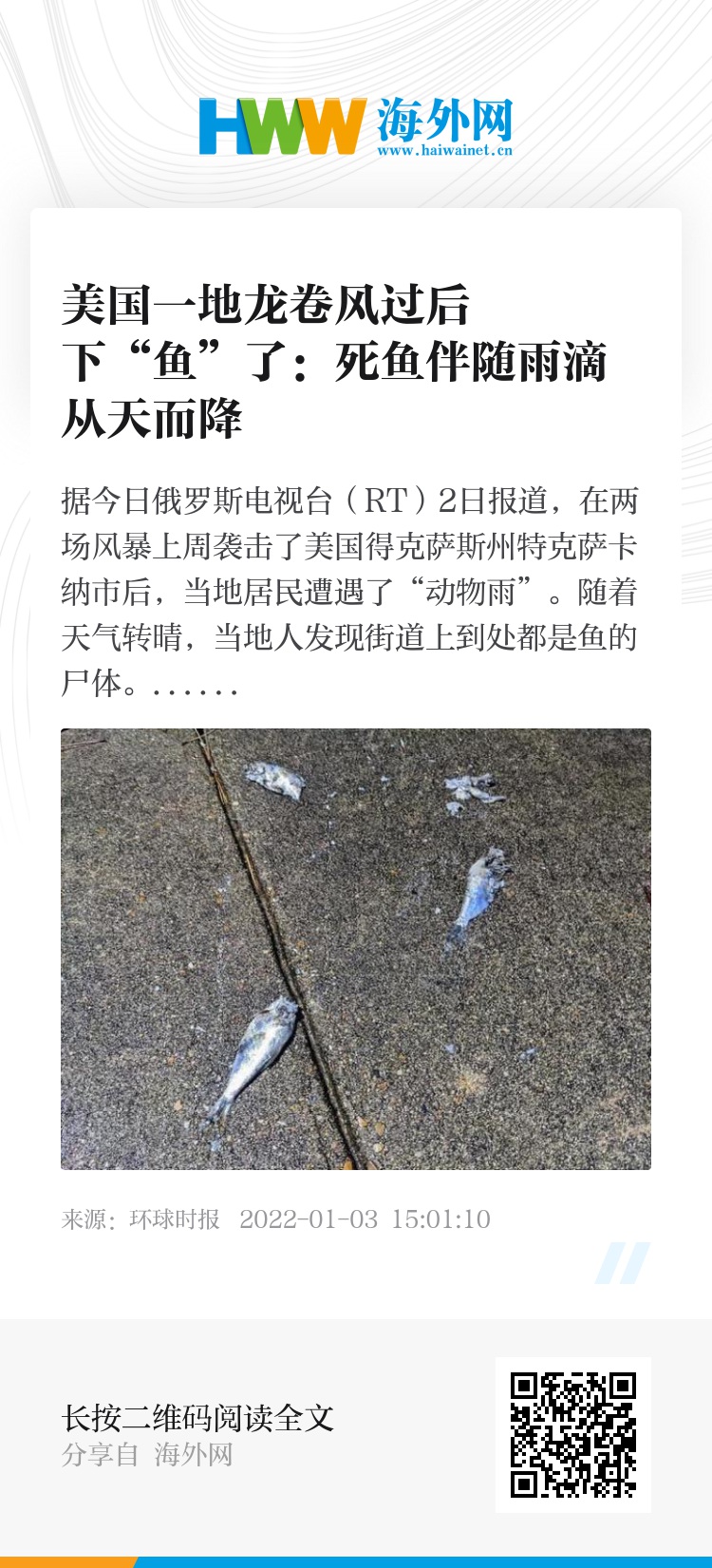 据今日俄罗斯电视台(RT)2日报道,在两场风暴上周袭击了美国得克萨斯州特克萨卡纳市后,当地居民遭遇了“动物雨”。随着天气转晴,当地人发现街道上到处都是鱼的尸体。