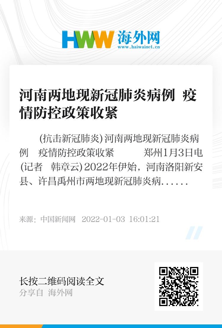中新网郑州1月3日电 (记者 韩章云)2022年伊始,河南洛阳新安县、许昌禹州市两地现新冠肺炎病例。连日来,该省多地收紧疫情防控政策,多举措阻断疫情传播。