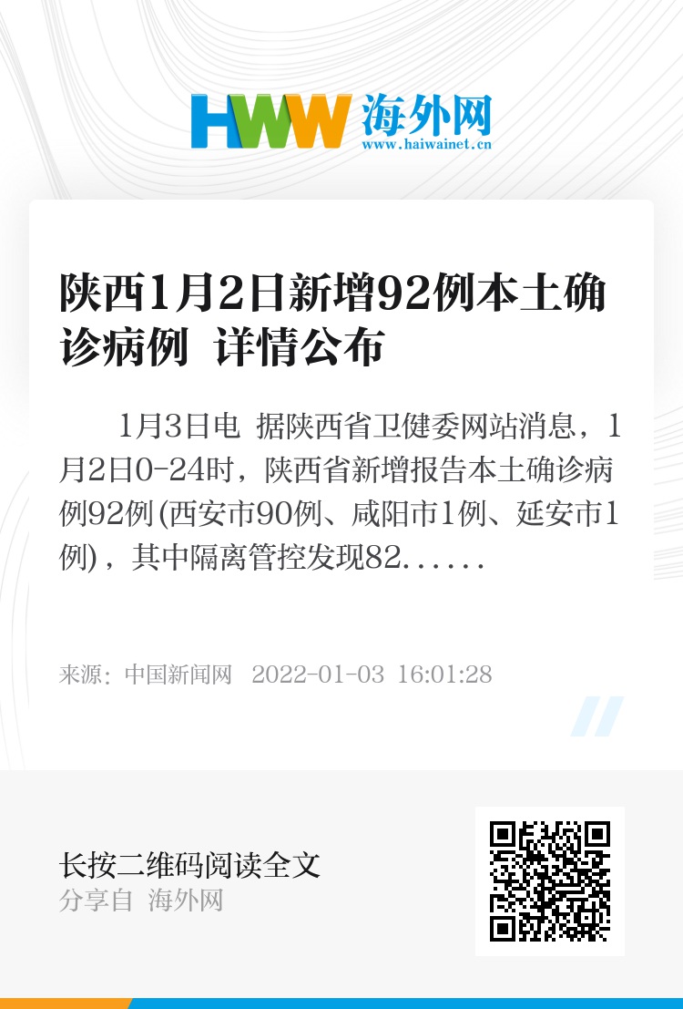 中新网1月3日电 据陕西省卫健委网站消息,1月2日0-24时,陕西省新增报告本土确诊病例92例(西安市90例、咸阳市1例、延安市1例),其中隔离管控发现82例、封控区筛查发现10例;治愈出院3例。自12月9日以来,全省累计报告本土确诊病例1690例(西安市1663例、咸阳市13例、延安市13例、渭南市1例),其中出院11例、在院1679例。
