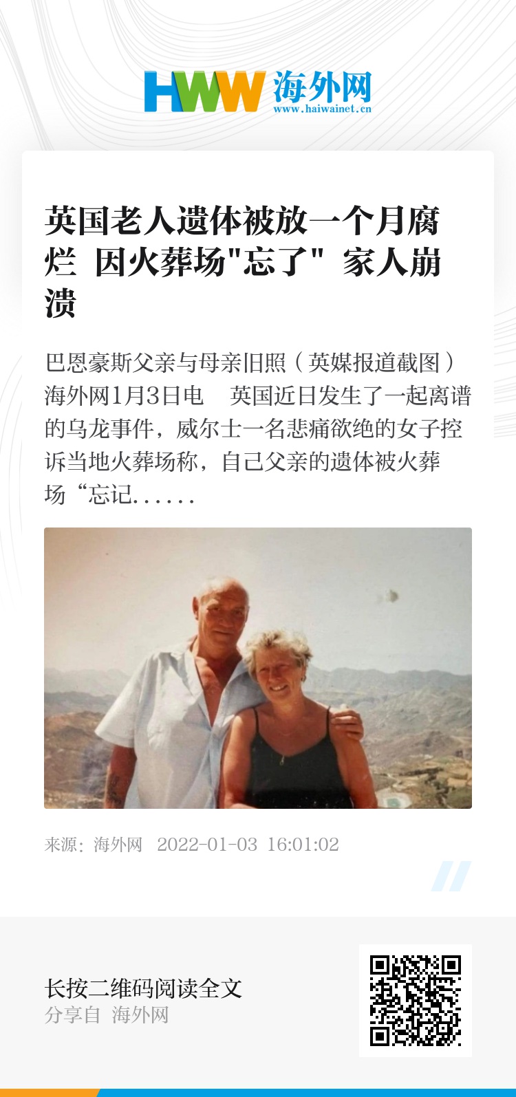 海外网1月3日电 英国近日发生了一起离谱的乌龙事件,威尔士一名悲痛欲绝的女子控诉当地火葬场称,自己父亲的遗体被火葬场“忘记了”,直到自己去索要骨灰时才发现。因放置长达一个月之久,遗体早已严重腐坏。