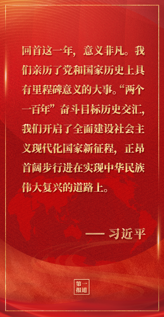 回首这一年,意义非凡。我们亲历了党和国家历史上具有里程碑意义的大事。“两个一百年”奋斗目标历史交汇,我们开启了全面建设社会主义现代化国家新征程,正昂首阔步行进在实现中华民族伟大复兴的道路上。