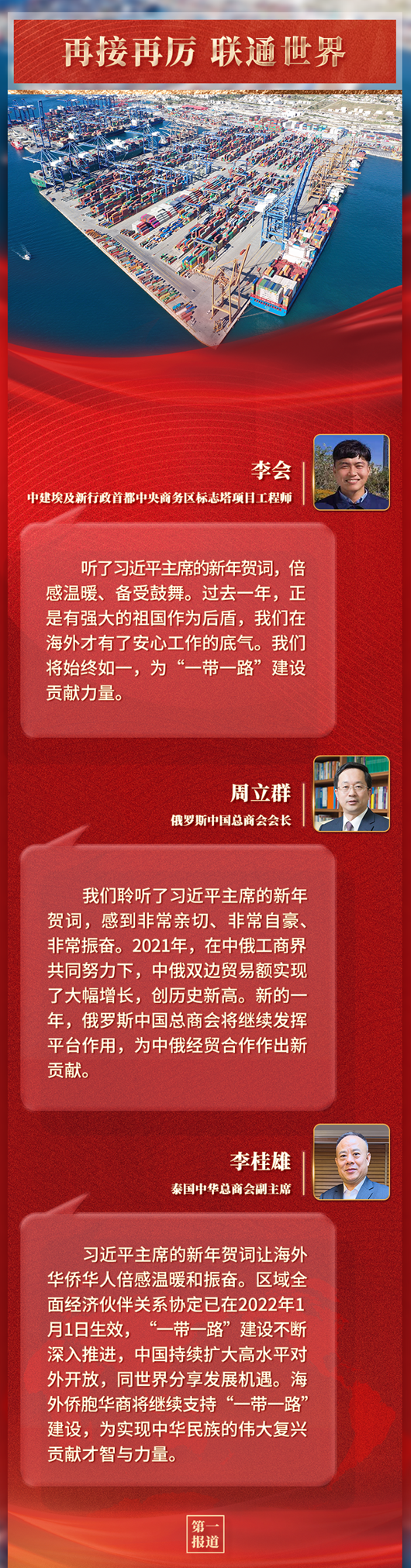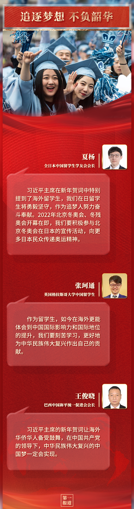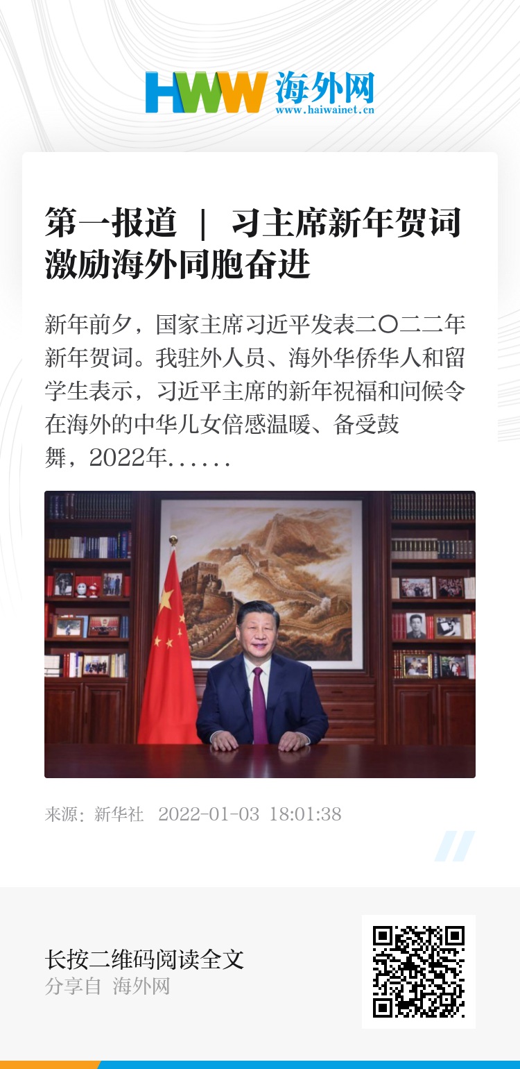 新年前夕,国家主席习近平发表二〇二二年新年贺词。我驻外人员、海外华侨华人和留学生表示,习近平主席的新年祝福和问候令在海外的中华儿女倍感温暖、备受鼓舞,2022年,他们将踔厉奋发、笃行不怠,为祖(籍)国全面建设社会主义现代化国家、实现第二个百年奋斗目标和推动构建人类命运共同体作出新的贡献。