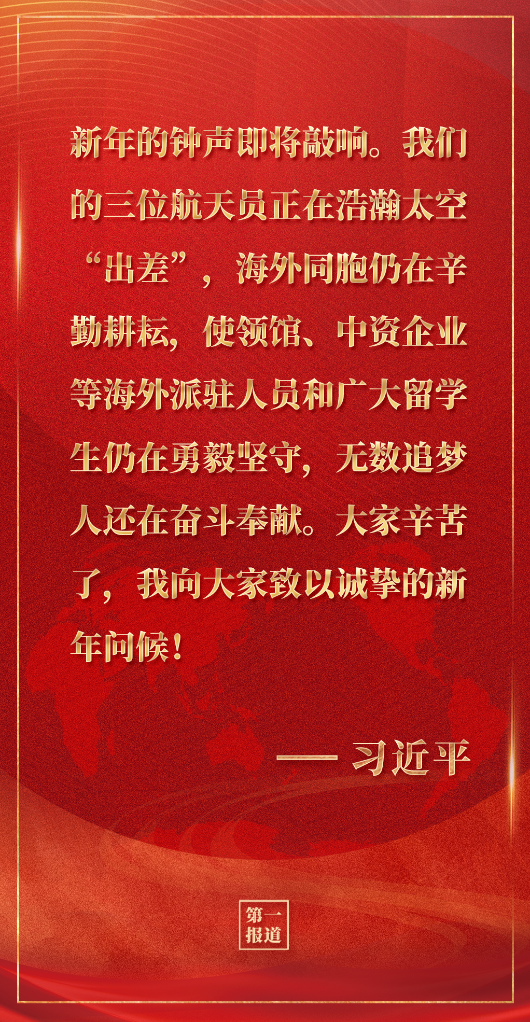 新年的钟声即将敲响。我们的三位航天员正在浩瀚太空“出差”,海外同胞仍在辛勤耕耘,使领馆、中资企业等海外派驻人员和广大留学生仍在勇毅坚守,无数追梦人还在奋斗奉献。大家辛苦了,我向大家致以诚挚的新年问候!