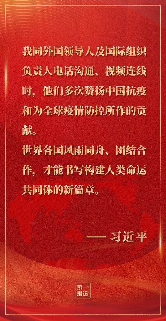 我同外国领导人及国际组织负责人电话沟通、视频连线时,他们多次赞扬中国抗疫和为全球疫情防控所作的贡献。截至目前,中国累计向120多个国家和国际组织提供20亿剂新冠疫苗。世界各国风雨同舟、团结合作,才能书写构建人类命运共同体的新篇章。