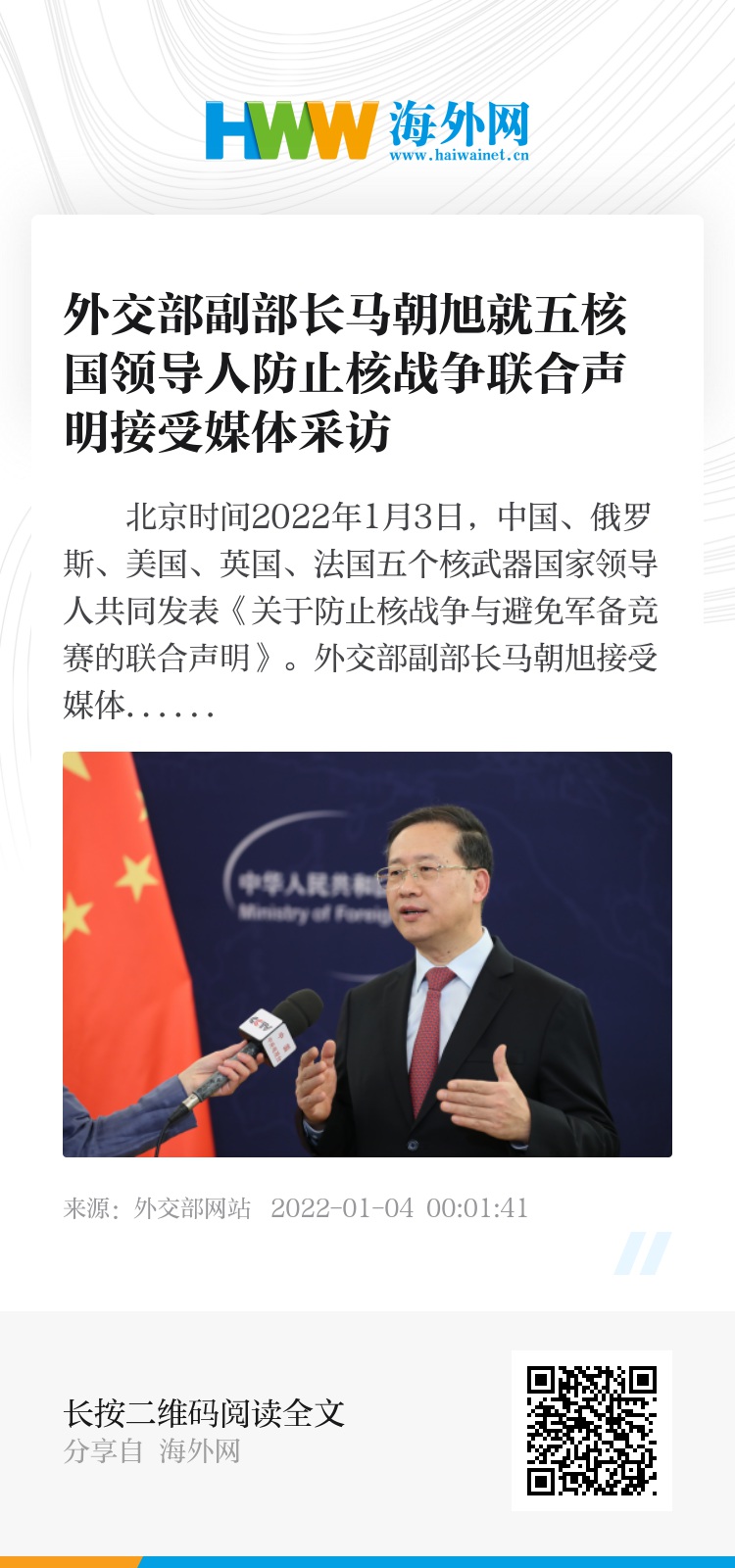北京时间2022年1月3日,中国、俄罗斯、美国、英国、法国五个核武器国家领导人共同发表《关于防止核战争与避免军备竞赛的联合声明》。外交部副部长马朝旭接受媒体采访,介绍联合声明的重要意义和中方所作努力,以及中方关于加强核领域全球治理的主张。