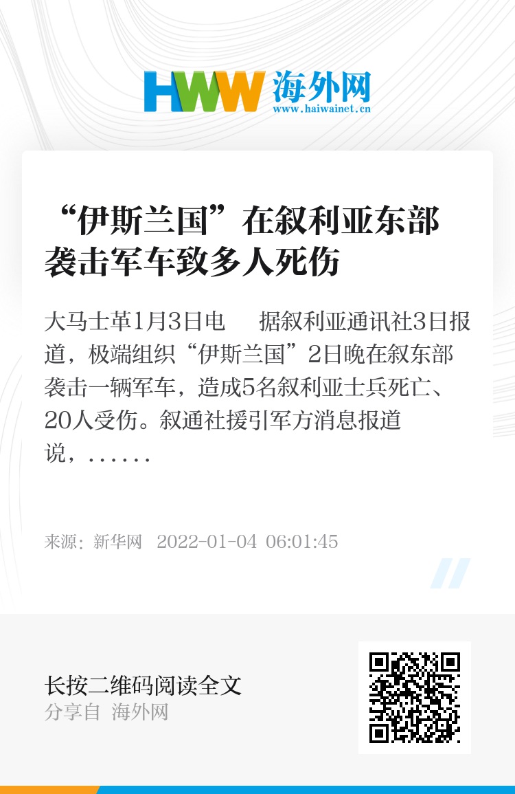 新华社大马士革1月3日电 据叙利亚通讯社3日报道,极端组织“伊斯兰国”2日晚在叙东部袭击一辆军车,造成5名叙利亚士兵死亡、20人受伤。
