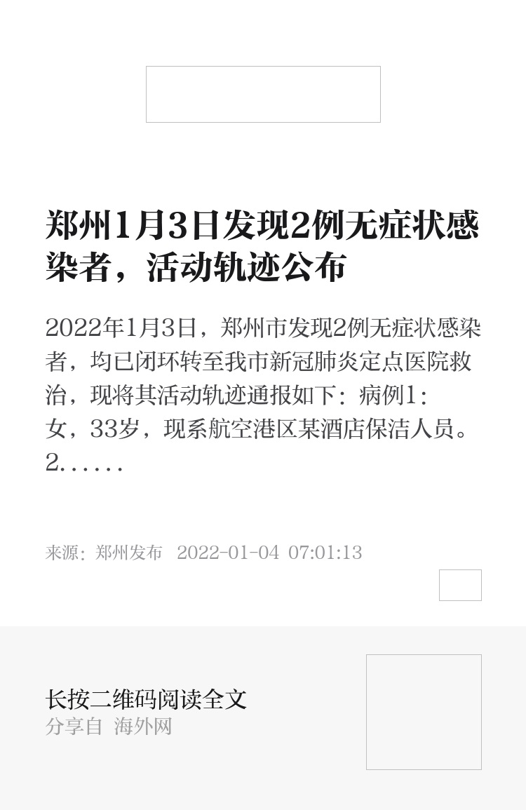 2022年1月3日,郑州市发现2例无症状感染者,均已闭环转至我市新冠肺炎定点医院救治,现将其活动轨迹通报如下: