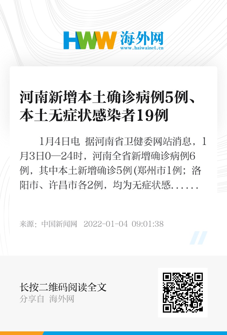 中新网1月4日电 据河南省卫健委网站消息,1月3日0—24时,河南全省新增确诊病例6例,其中本土新增确诊5例(郑州市1例;洛阳市、许昌市各2例,均为无症状感染者转确诊),境外输入确诊病例1例;新增本土无症状感染者19例(郑州市1例,许昌市18例);无新增疑似病例。