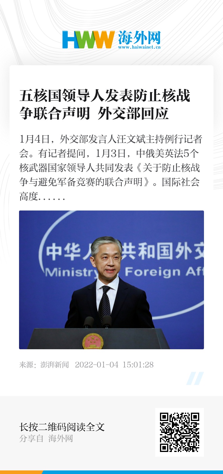 汪文斌介绍道,北京时间1月3日晚9点,中俄美英法5个核武器国家领导人同步发表《关于防止核战争与避免军备竞赛的联合声明》,声明核战争打不赢也打不得,重申不将核武器瞄准彼此或其他任何国家,承诺维护和遵守双多边军控协议,强调五国应避免军事对抗,防止军备竞赛。中方认为,五国领导人首次就核武器问题发表联合声明,体现了五国防止核战争的政治意愿,发出了维护全球战略稳定,减少核冲突风险的共同声音,对于构建总体稳定、均衡发展的大国关系也具有积极意义。中方希望五国不断增进战略互信,加强沟通与合作,为建设持久和平、普遍安全的世界发挥积极作用。