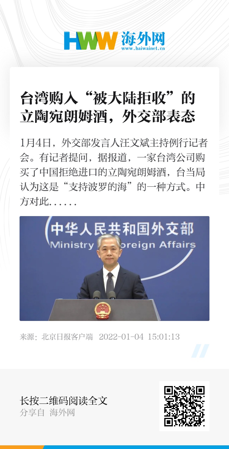 有记者提问,据报道,一家台湾公司购买了中国拒绝进口的立陶宛朗姆酒,台当局认为这是“支持波罗的海”的一种方式。中方对此有何评论?