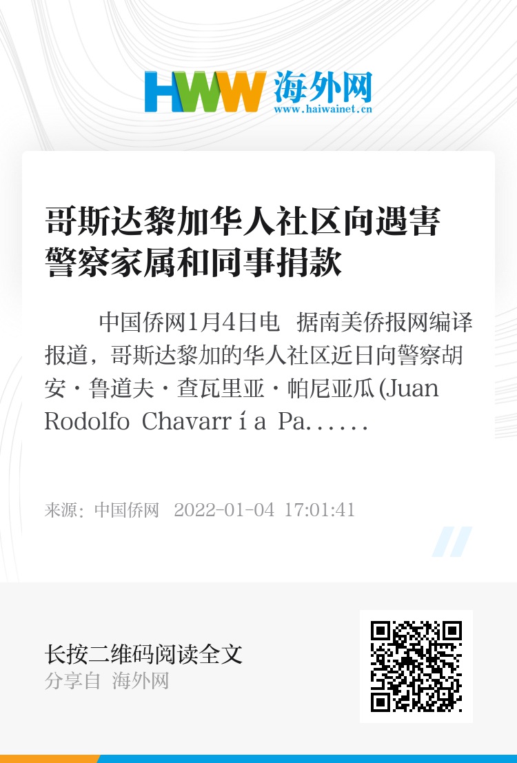 中国侨网1月4日电 据南美侨报网编译报道,哥斯达黎加的华人社区近日向警察胡安·鲁道夫·查瓦里亚·帕尼亚瓜(Juan Rodolfo Chavarría Paniagua)的家人和同事捐赠了2625万科朗(约合人民币25.9万元)。这位警察2021年12月22日在埃雷迪亚省(Heredia)一家超市的抢劫案中被杀害。