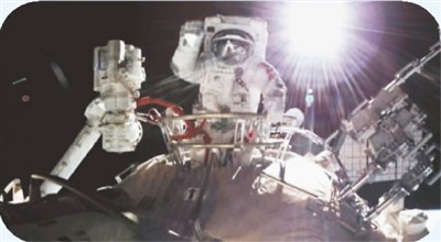 2021年11月7日,在北京航天飞行控制中心拍摄的神舟十三号航天员翟志刚出舱画面。