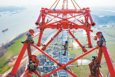 2021年12月26日,安徽送变电工程有限公司施工人员在长江大跨越特高压输电钢管塔封顶施工现场作业。