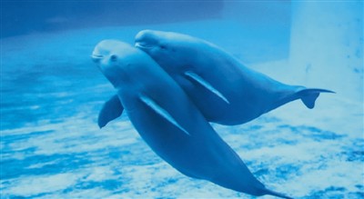 在中国科学院水生生物研究所白鱀豚馆里,江豚妈妈洋洋和小江豚在水中游动。