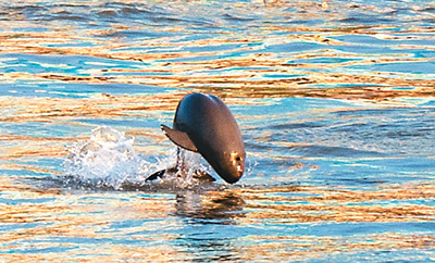 湖北省宜昌市江边,长江江豚在水中嬉戏。