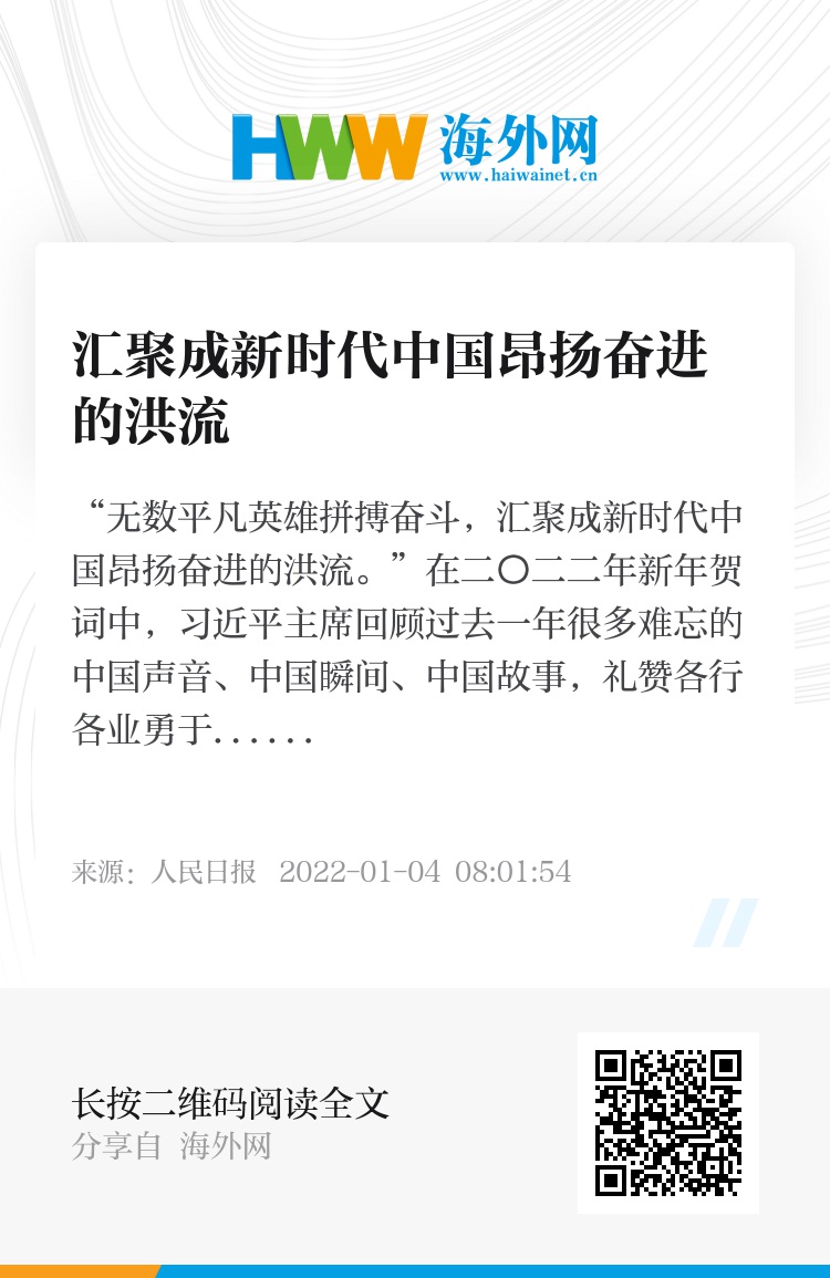 “无数平凡英雄拼搏奋斗,汇聚成新时代中国昂扬奋进的洪流。”在二〇二二年新年贺词中,习近平主席回顾过去一年很多难忘的中国声音、中国瞬间、中国故事,礼赞各行各业勇于拼搏、矢志奋斗的平凡英雄,激扬起亿万人民奋进新征程、建功新时代的豪情壮志。