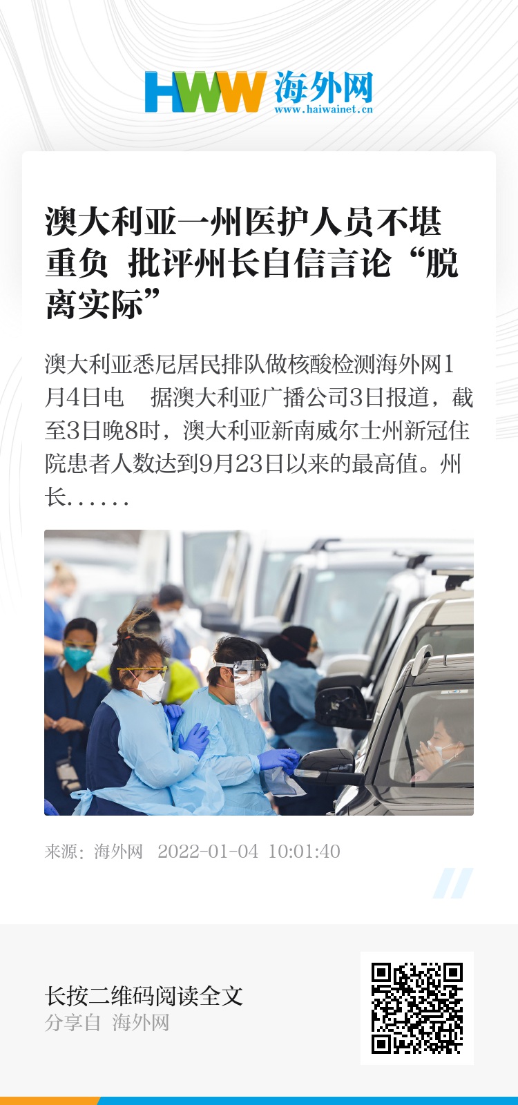 报道称,新南威尔士州州长多米尼克·佩罗泰特日前坚称,该州医疗系统已做好准备,疫情状况处于掌控之中。根据州卫生系统公布的最新数据,截至3日晚8时,该州新增1066名新冠住院患者,现有住院患者达1204名。悉尼医院的工作人员表示,医生和护士假期期间都在加班加点工作,工作量已超负荷,尽管医疗人员都在长时间地努力工作,但这是不可持续的,一些人已经因此提出辞职或提前退休。这名工作人员还称,州长的言论脱离实际,“如果他能来医院体验一周那绝对是件好事”。