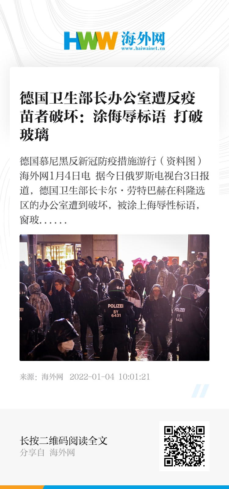 海外网1月4日电 据今日俄罗斯电视台3日报道,德国卫生部长卡尔·劳特巴赫在科隆选区的办公室遭到破坏,被涂上侮辱性标语,窗玻璃被打破。肇事者为激进的新冠病毒否认者和反疫苗人士。