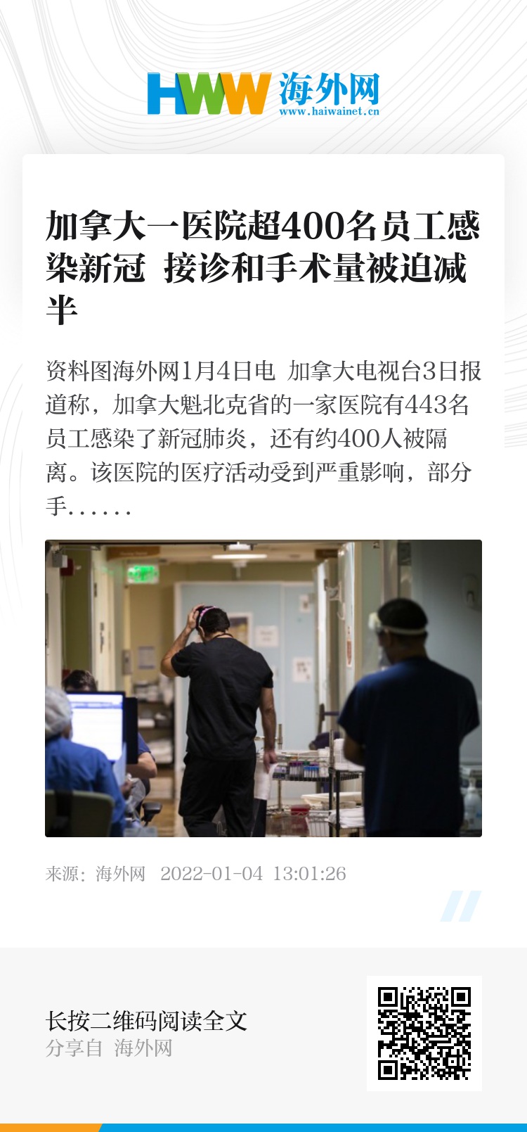 海外网1月4日电 加拿大电视台3日报道称,加拿大魁北克省的一家医院有443名员工感染了新冠肺炎,还有约400人被隔离。该医院的医疗活动受到严重影响,部分手术和医疗服务将会被取消或推迟。