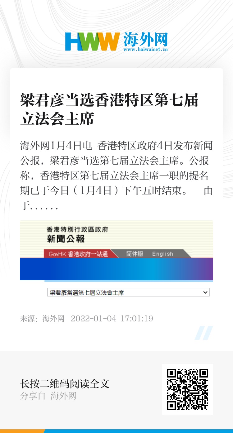 海外网1月4日电 香港特区政府4日发布新闻公报,梁君彦当选第七届立法会主席。